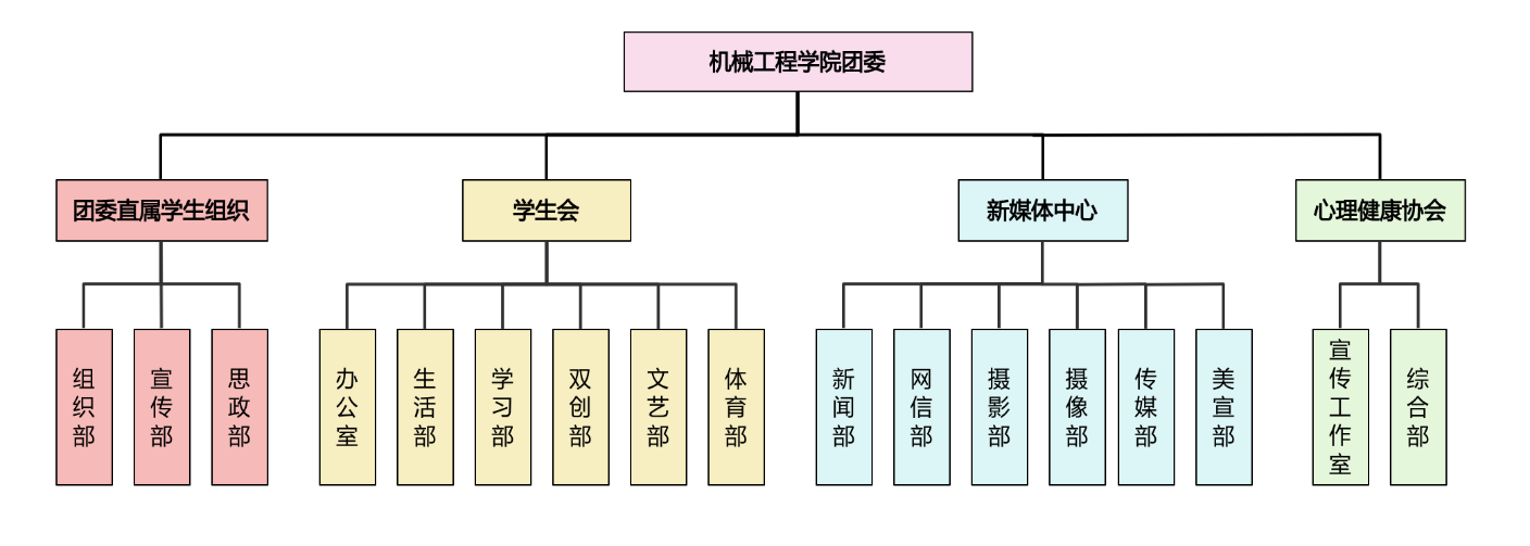 团委下设团委直属学生组织、学生会、新媒体中心和心理健康协会四大学生组织。